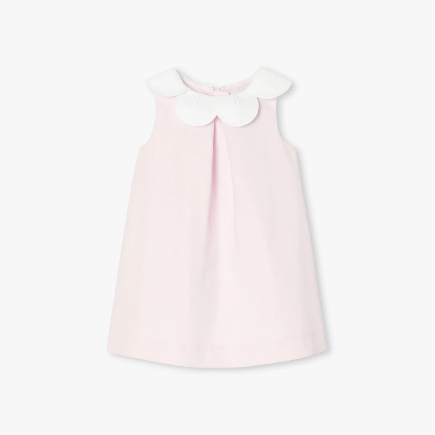 Esprit 60's avec sa coupe trapèze minimaliste, la robe de cérémonie bébé fille dévoile tout son chic. Confectionnée en coton alvéolé, un col pétales contrasté sublime cette pièce à marier à un chapeau et de jolis salomés pour le grand jour.-Robe trapèze bébé fille en coton biologique-Tissu alvéolé-Col pétales contrasté-Ouverture par zip invisible au dos