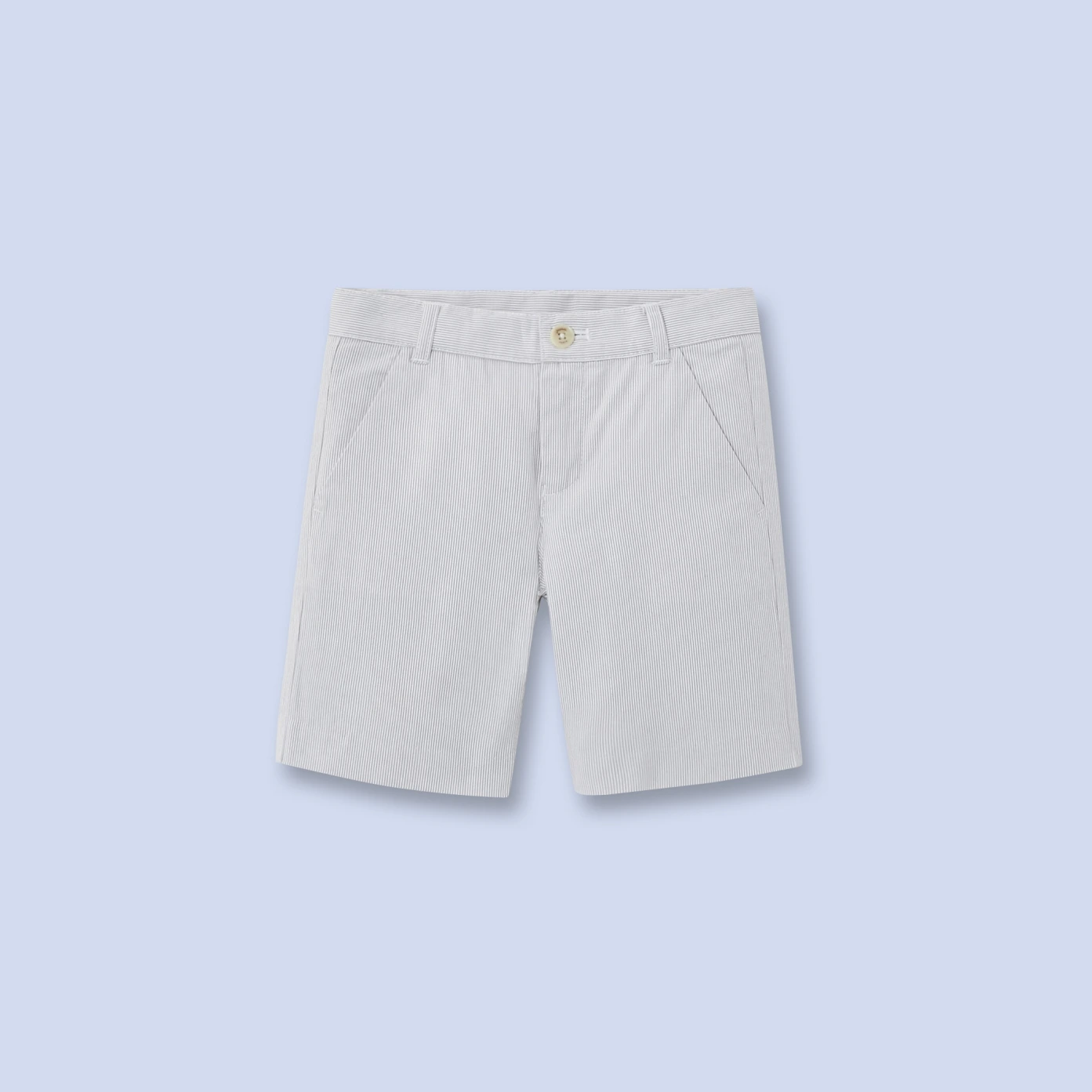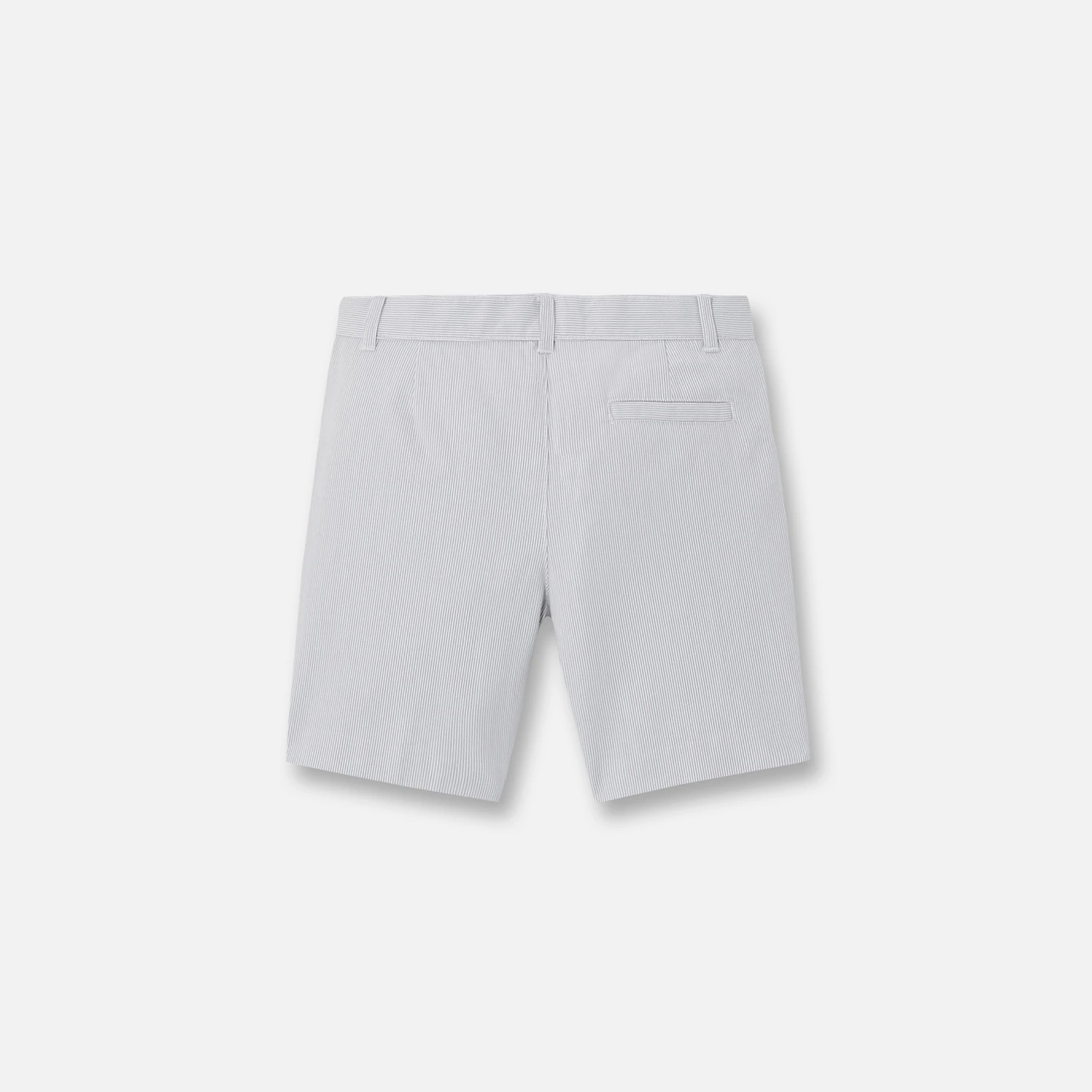 Bermuda en piqué de coton rayé blanc gris Ceinture rapportée avec passant ceinture intérieure élastiquée ajustable 2 poches italiennes devant et 1 poche passepoilée au dos